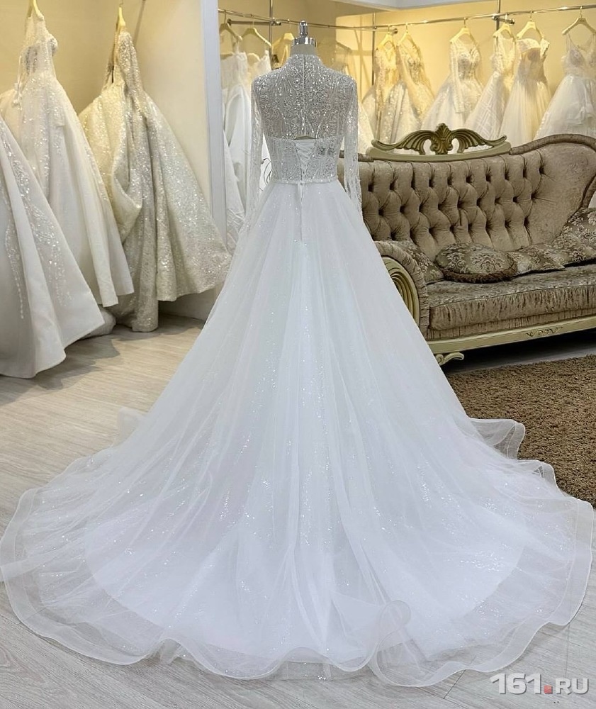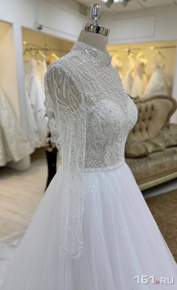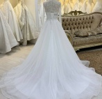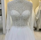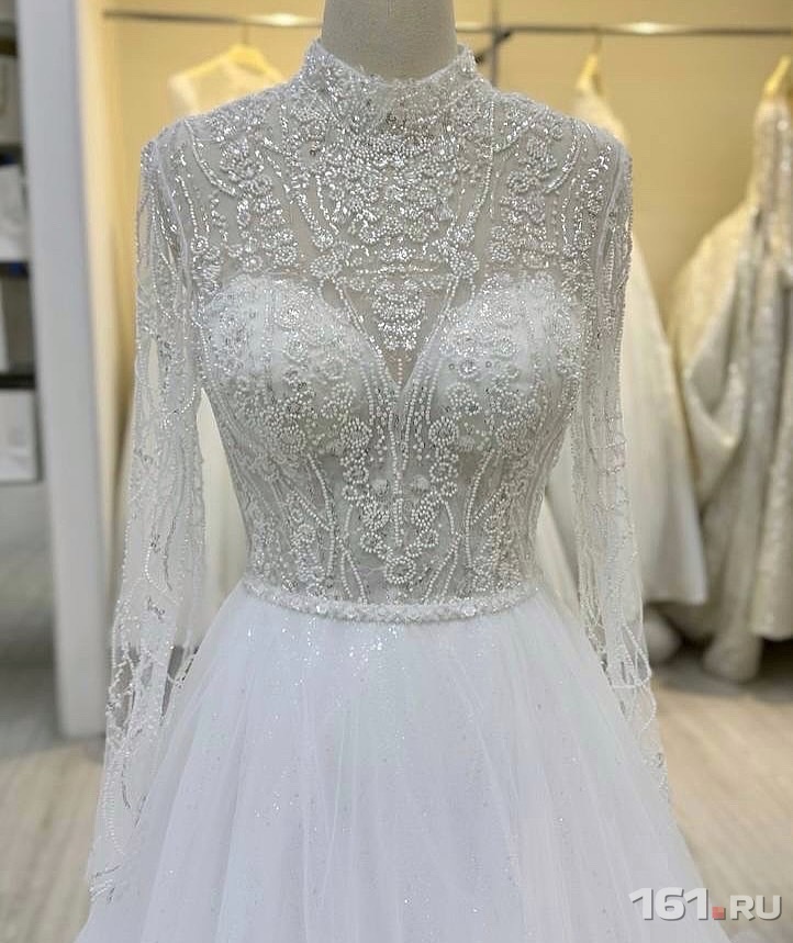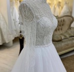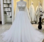 Свадебное платье с закрытым верхом и рукавом, украшено бисером и пайетками.