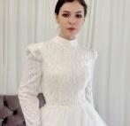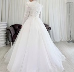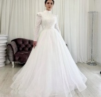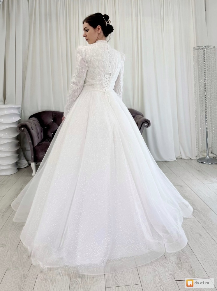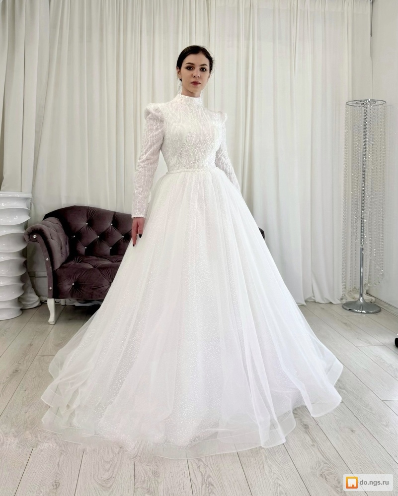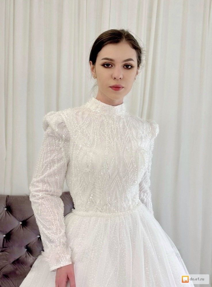 Свадебное платье А-силуэт - светоотражающая юбка, рукава и поясок, закрытый верх расшит бисером и пайетками.