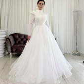 Свадебное платье с закрытым верхом и рукавом, украшено бисером и пайетками.