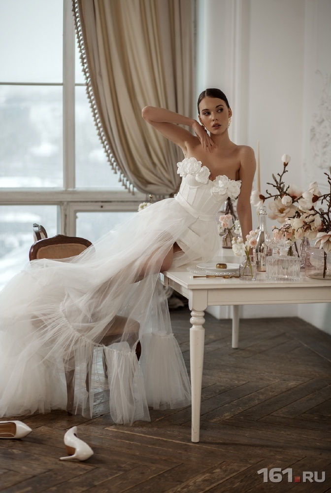 Свадебное платье White Rose. Фасон А-силуэт, ткань верха матова органза. Корсет декорирован расшитым кружевом и ручной драпировкой. Съёмные элементы бретели с цветами.
