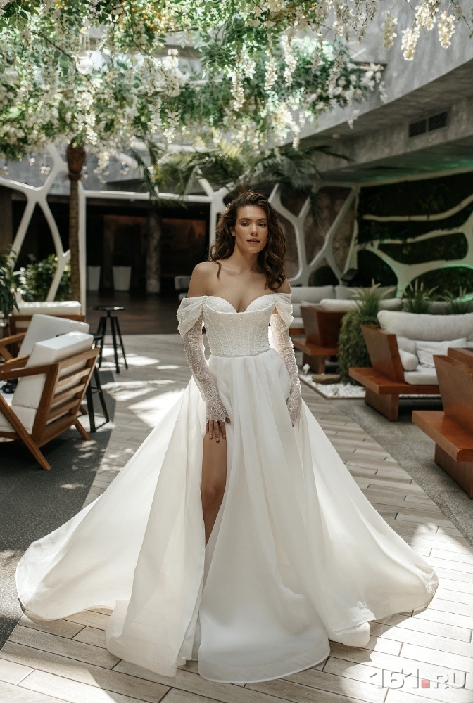 Свадебное платье Avi - воздушная модель, открытые плечи, украшенные рукава и вырез галочка.